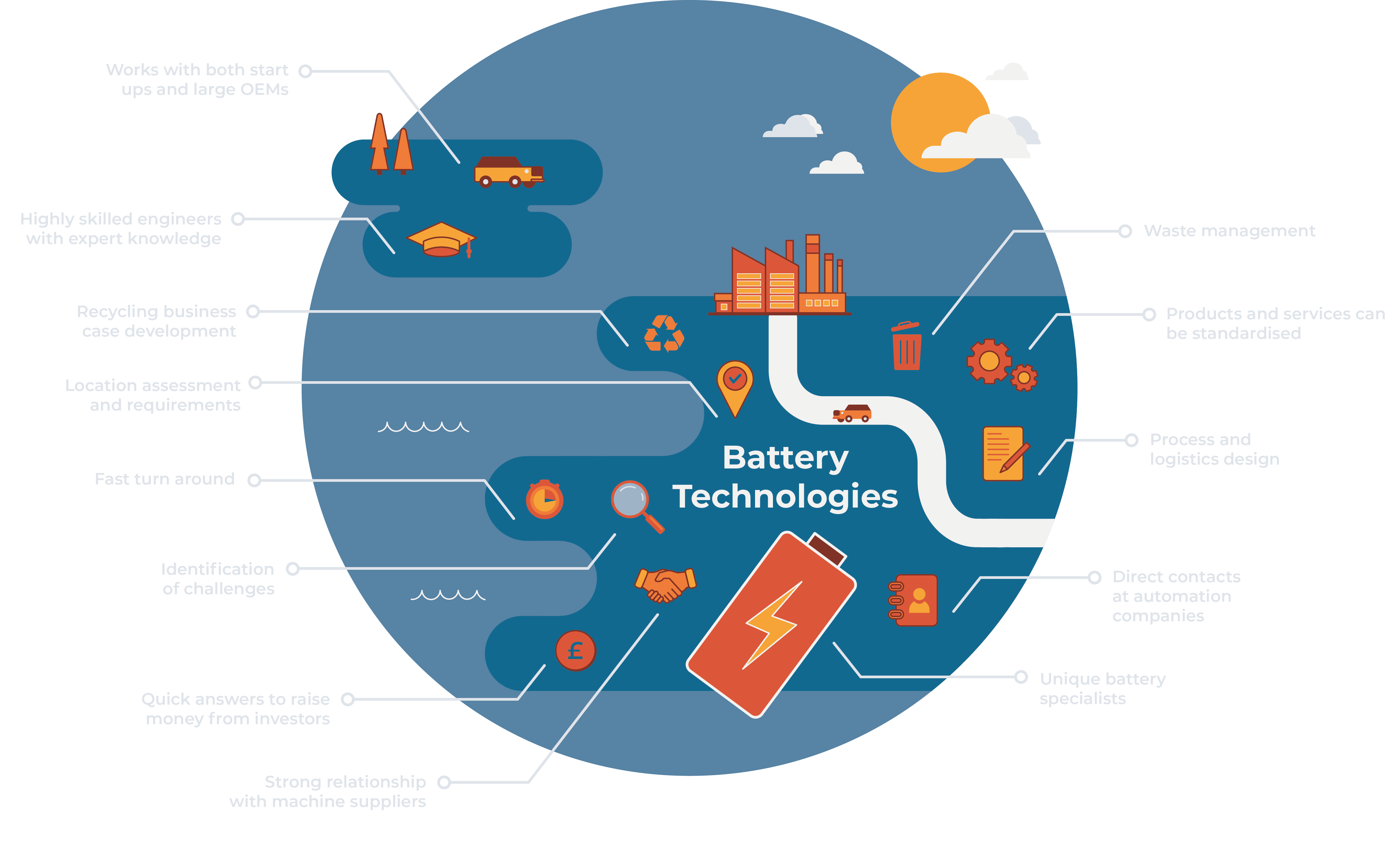 Our battery technologies team covers everything from concept development to facility launch, from pilot scale to high volume manufacture and scale up, as well as processes optimisation, and manufacturing strategy. We know the who, what, how and how much, and pride ourselves on working with some of the UK’s leading cell and pack manufacturers.​ We can also assist you in navigating the complex field of battery-related legislation and develop strategies for battery end-of-life recovery.