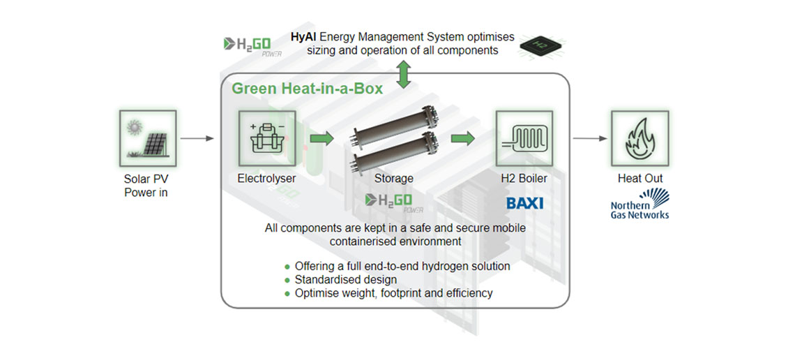 In this project, H2GO Power, a London based company developing innovative hydrogen-based software and hardware solutions, together with BAXI, a global commercial heating and hot water systems solutions business, form a potent consortium to demonstrate a novel solution (heat-in-a-box) at Northern Gas Network’s (NGN) facilities, for decarbonising a network’s major industrial operation ­ gas preheating, which is of high energy intensity and risk. Failure on its operation may damage the whole network and raise issues of national security. The final heat-in-a-box containerised solution will be designed, built, and fully tested by the Manufacturing Technology Centre (MTC).